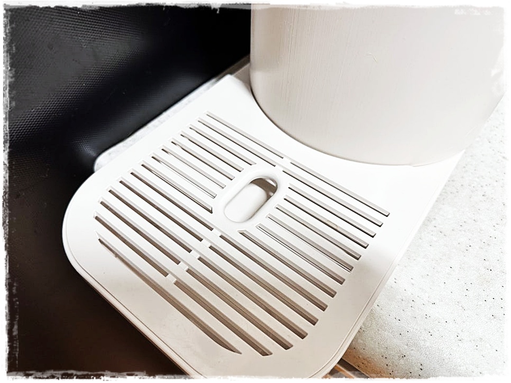- 커버·물받이 복귀 — 필터 커버를 다시 끼우고, 물받이를 홈에 밀착시켜 밀어 넣은 뒤 출수구를 원래 위치로.